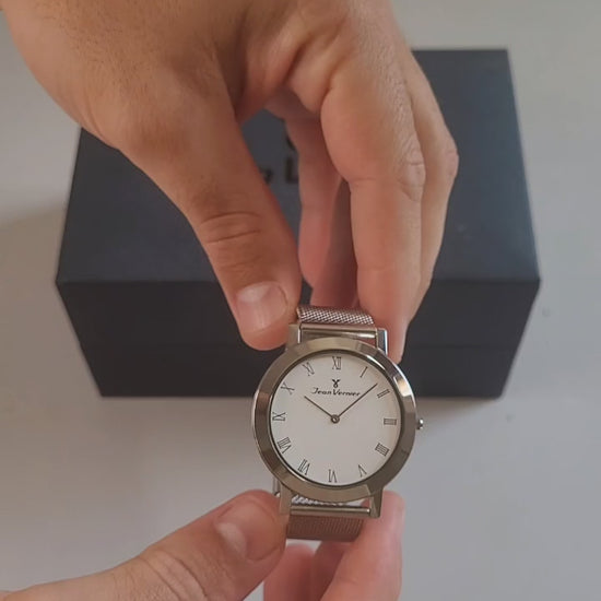Relógio caixa de aço 316L com 38mm de diâmetro e mostrador na cor branco. Pulseira em malha de aço.
