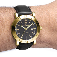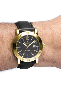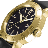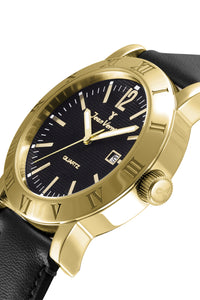 Relógio com caixa de aço prata ou dourado 316L, 42mm de diâmetro, mostrador branco ou preto texturizado, contadores cravados, calendário e pulseira couro marrom ou preta.