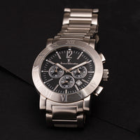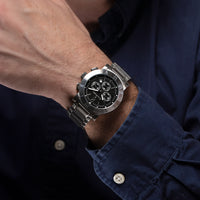 Relógio com caixa de aço 316L, 42mm de diâmetro, mostrador preto ou branco texturizado, contadores cravados, calendário, cronógrafo, pulseira de aço 316L.