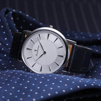 Relógio caixa de aço 316L, 40mm de diâmetro, mostrador cinza ou preto com textura e contadores cravados, pulseira de couro tipo croco marrom ou preto.