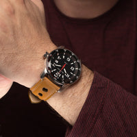 Relógio com caixa de aço 316L prateado, 46mm de diâmetro e mostrador branco ou preto. Pulseira de couro em cor havana, marrom ou preto.