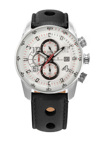 Relógio com caixa de aço 316L prateado, 46mm de diâmetro e mostrador branco ou preto. Pulseira de couro em cor havana, marrom ou preto.