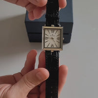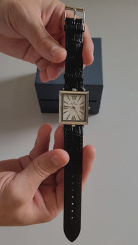 Relógio com caixa de aço 316L nas cores prata ou dourado, 30x41mm de tamanho, mostrador na cor branco, contadores cravados e pulseira de couro preto.