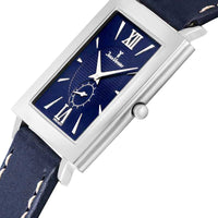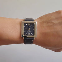 Relógio caixa de aço 316L com 33x42mm de tamanho e mostrador na cor azul e pulseira de couro lisa azul.