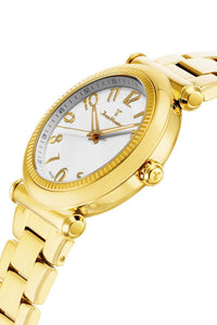 Relógio com caixa e pulseira de aço 316L dourado, 40mm de diâmetro, mostrador preto, branco ou dourado texturizado, contadores cravados.