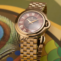 Relógio com caixa e pulseira de aço 316L dourado, 41mm de diâmetro, mostrador marrom, branco ou dourado texturizado, contadores cravados