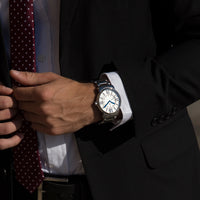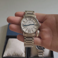 Relógio caixa e pulseira de aço 316L nas cores dourado ou prata, 44mm de diâmetro, mostrador branco ou preto com textura, contadores pintados.