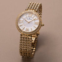 Relógio com caixa e pulseira de aço 316L nas opções dourado ou rosé, 37mm de diâmetro, mostrador madrepérola preto ou branco texturizado, contadores cravados.
