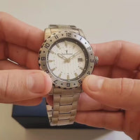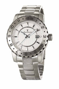 Relógio com caixa de aço 316L, 43mm de diâmetro, mostrador branco ou azul texturizado, contadores cravados, calendário, pulseira de aço 316L.