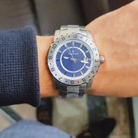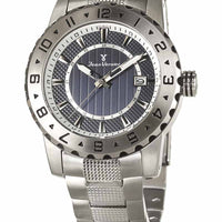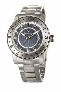 Relógio com caixa de aço 316L, 43mm de diâmetro, mostrador branco ou azul texturizado, contadores cravados, calendário, pulseira de aço 316L.