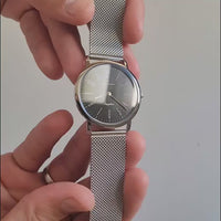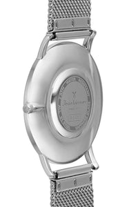 Relógio caixa de aço 316L, com 37mm de diâmetro, mostrador branco, preto ou azul. Pulseira de couro ou aço prateado.