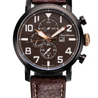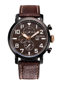 Relógio com caixa de aço preto 316L, 47mm de diâmetro, mostrador marrom, contadores pintados em alto relevo, calendário, pulseira de couro marrom escuro com costura branca.