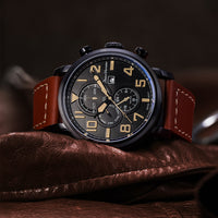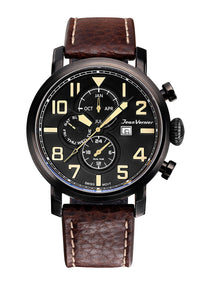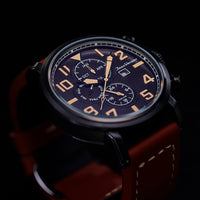 Relógio com caixa de aço preto, prata ou ouro rosê 316L, 47mm de diâmetro, mostrador preto, azul ou marrom contadores pintados em alto relevo, calendário, pulseira de couro nas preta, azul , marrom claro ou marrom escuro com peso branco.