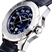 Relógio com caixa de aço 316L nas cores prata ou preta com aro prata, preto ou rosegold, 46mm de diâmetro, mostrador prata, preto ou azul, contadores chancelados e pintados, calendário, pulseira de couro preta, marrom ou azul, com pesponto.