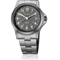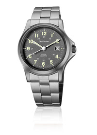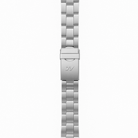 Pulseira em aço inoxidável prateado, com o fecho do tipo dobrável com trava.
