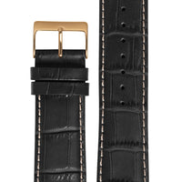 Pulseira de couro tipo croco nas cores preto, marrom ou azul, com 24mm de largura e fivela de aço nas cores rosegold, dourado ou prata.