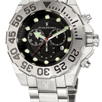 Relógio com caixa de aço 316L, 48mm de diâmetro, mostrador cinza ou preto, bísel da cor prateado, preto ou azul e pulseira de aço.