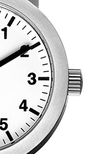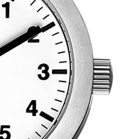 Relógio com caixa de aço 316L, 35mm de diâmetro e mostrador branco.