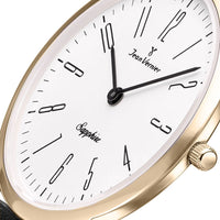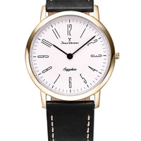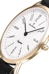 Relógio caixa de aço 316L, 37mm de diâmetro nas cores dourado ou prata, mostrador branco. Pulseira de couro nas cores havana, marrom e preto.