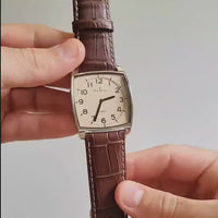 Relógio com caixa de aço 316L, 36x44mm de tamanho, mostrador na cor nude. Pulseira de couro marrom.
