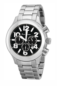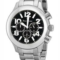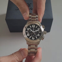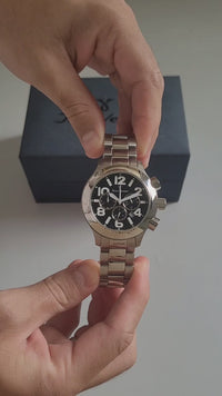 Relógio com caixa de aço 316L, 44mm de diâmetro, mostrador preto com calendário e pulseira de aço inoxidável.