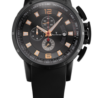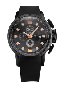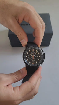 Relógio com caixa de aço 316L, 46mm de diâmetro, mostrador preto com detalhes rosegold. Com calendário, cronógrafo e pulseira de silicone.